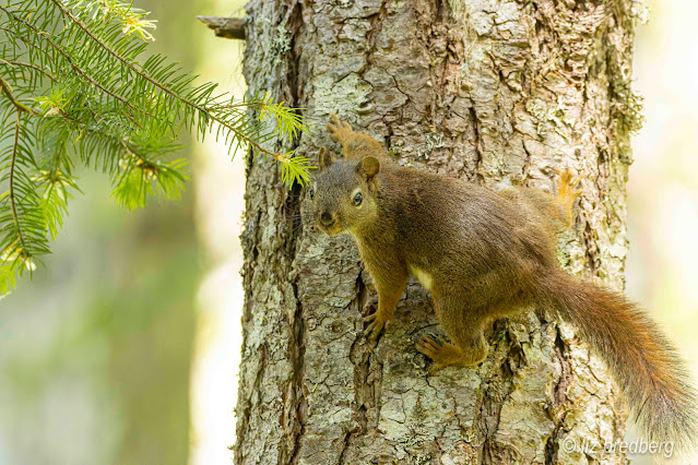 A red squirrel, his fine fur luxuriant, watched us as we left the marsh.